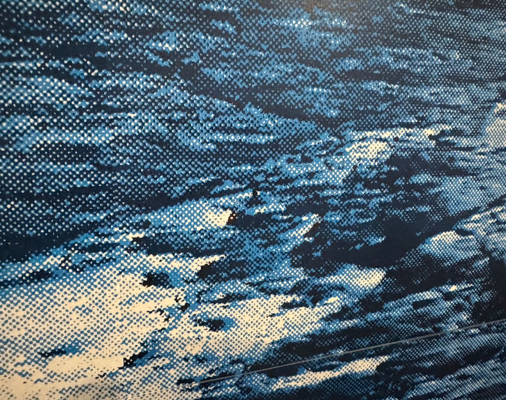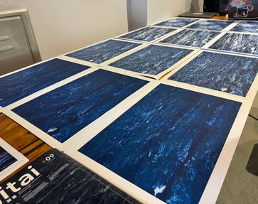 當我們將沉積岩的照片色調調整為藍色時,發現岩石表面竟然能夠轉化為類似海景的視覺效果。我們希望利用絲網印刷中被視為缺陷的不規則紋理與褪色現象,來探索版畫印刷的新可能性。